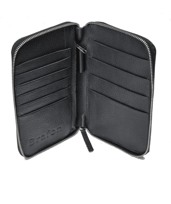 2x12x20cmPorta pasaporte realizado en cuero vacuno granulado. Bolsillos forrados para guardar hasta 10 pasaportes. Soporte para lapicera, y bolsillo monedero de 16cm. Con relieves interiores para llevar hojas A5 en cada solapa. Logo BRAFON grabado en el interior.Bolsillos:10 Pasaportes